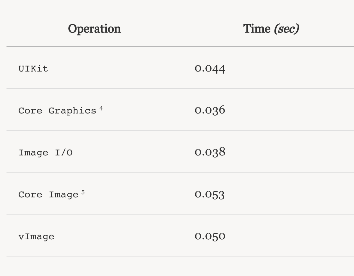 使用CPU的矢量处理器处理大图像。 强大的图像处理功能,包括Core Graphics和Core Video互操作,格式转换和图像处理。