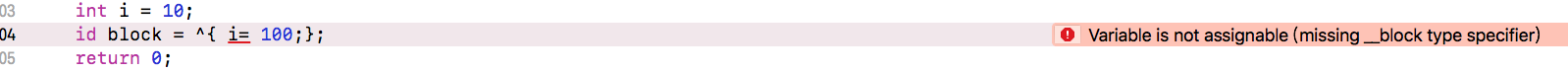是将i传入到Block中,传入的是个值类型,所以在我们block内部修改的时候会报错