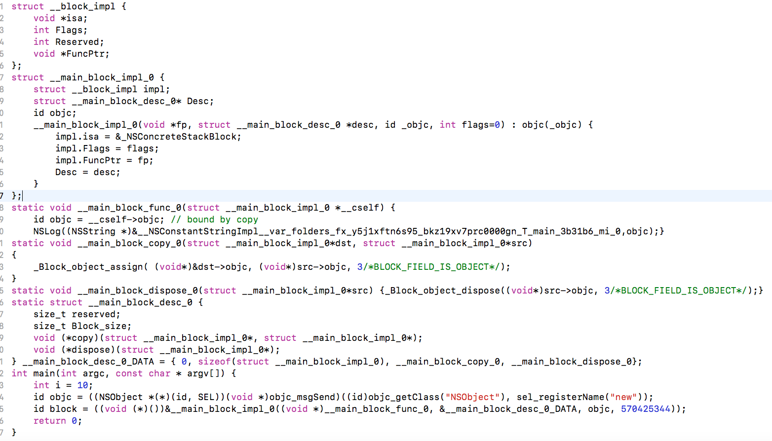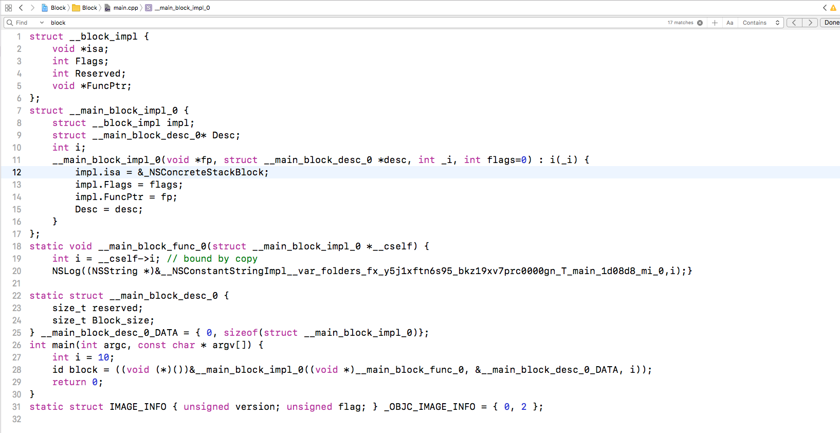 __main_block_impl_0结构体中多了个int i成员,同时,在main方法中