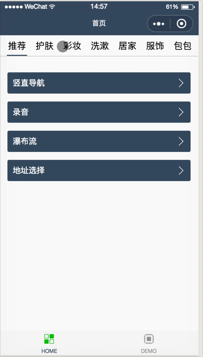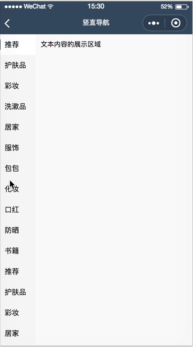 导航需要手动滑动切换,小程序的操作流程度只能说优与 浏览器,还是比不上native,有时候滑动出现卡顿,最可怕的是出现滚动条,顿时会觉得有点 low