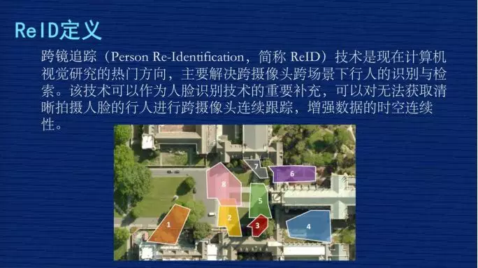右边是 ReID 的技术特点:首先,ReID 是属于行人识别,是继人脸识别后的一个重要研究方向。另外,研究的对象是人的整体特征,包括衣着、体形、发行、姿态等等。它的特点是跨摄像头,跟人脸识别做补充。