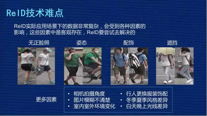 为什么?第一,ReID 有很多技术难点。比如 ReID 在实际应用场景下的数据非常复杂,会受到各种因素的影响,这些因素是客观存在的,ReID 必须要尝试去解决。