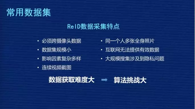 这些都是 ReID 数据采集的特点,可以归结为一句话:“数据获取难度大,会对算法提出比较大的挑战。”问题很复杂,数据很难获取,那怎么办?现在业内尽量在算法层面做更多的工作,提高 ReID 的效果。