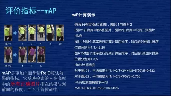 同样的算法,算出图片 2 的精度是 0.756。最后把所有图片的 mAP 求一个平均值,最后得到的 mAP 大概是 69.45。从这个公式可以看到,这个检索图在底库中所有的图片都会去计算 mAP,所以最好的情况是这个人在底库中所有的图片都排在前面,没有任何其他人的照片插到他前面来,就相当于同一个人所有的照片距离都是最近的,这种情况最好,这种要求是非常高的,所以 mAP 是比较能够综合体现这个模型真实水平的指标。