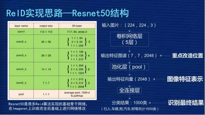 因为现在 ReID 的很多研究课题都是基于 Resnet50 结构去修改的。Resnet 一般会分为五层,图像输入是 (224,224,3),3 是 3 个通道,每层输出的特征图谱长宽都会比上一层缩小一半,比如从 224 到 112,112 到 56,56 到 28,最后第五层输出的特征图谱是 (7,7,2048)。