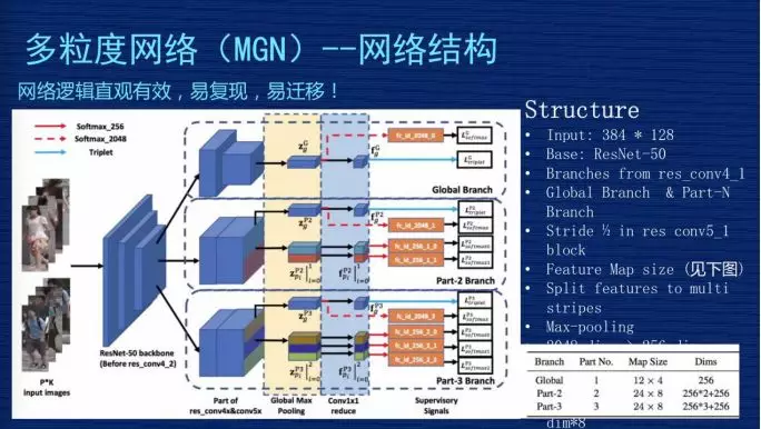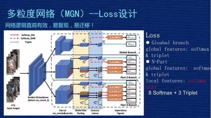 这是 MGN 的网络架构完整的图,这个网络图比较复杂,第一个,网络从结构上比较直观,从效果来讲是比较有效的,如果想复现我们的方案还是比较容易的。如果你是做深度学习其他方向的,我们这个方案也有一定的普适性,特别是关注细粒度特征时,因为我们不是只针对 ReID 做的。我们设计的结构是有一定普适性,我把它理解为“易迁移”,大家可以作为参考。