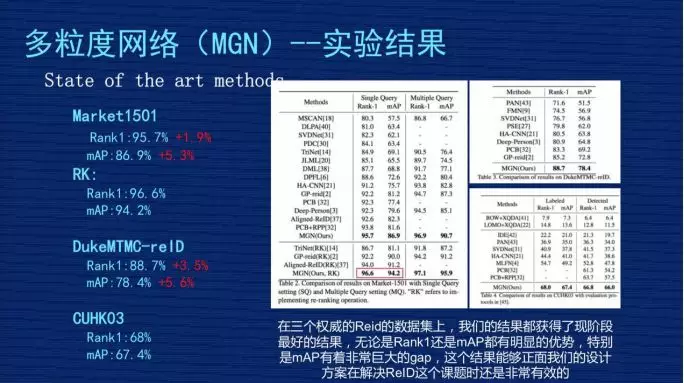 1、Market1501。我们不做 ReRank 的时候,原始的 Rank1 是 95.7%,mAP 是 86.9%,跟刚才讲的业内比较好的 PCB 那个文章相比,我们的 Rank1 提高差不多 1.9 个点,mAP 整整提高 5.3 个点,得到非常大的提升。
