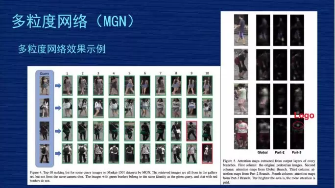 刚才讲了 ReID 研究方面的 5 个方案。接下来要讲的是多粒度网络的结构设计与实现。有人问 MGN 的名字叫什么,英文名字比较长,中文名字是对英文的一个翻译,就是“学习多粒度显著特征用于跨境追踪技术(行人在识别)”,这个文章是发表于 4 月初。