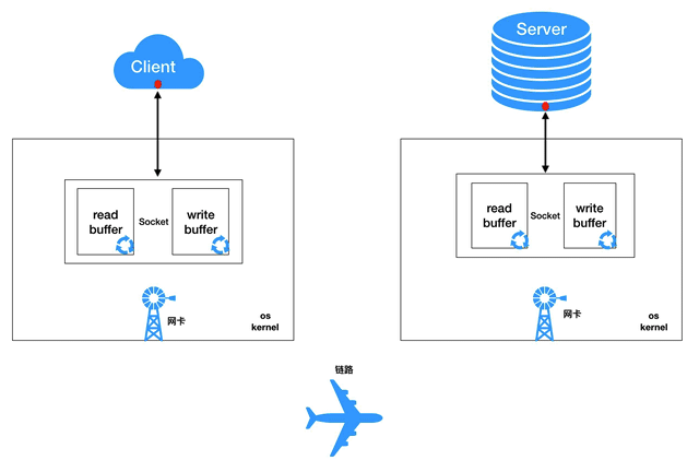 我们平时用到的套接字其实只是一个引用(一个对象ID),这个套接字对象实际上是放在操作系统内核中。这个套接字对象内部有两个重要的缓冲结构,一个是读缓冲(read buffer),一个是写缓冲(write buffer),它们都是有限大小的数组结构。