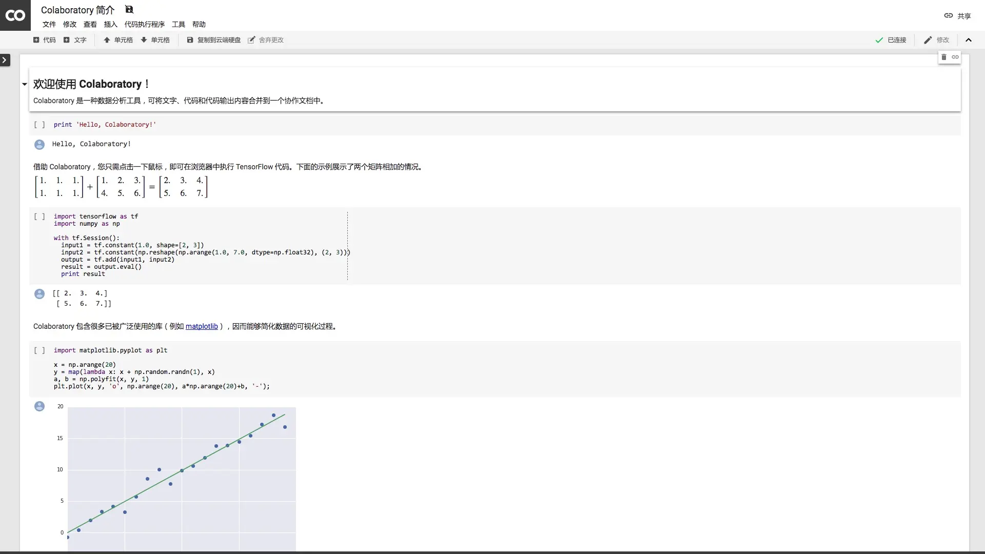 请用Google Chrome浏览器打开这个链接,你可以看到这份“Colaboratory简介”。