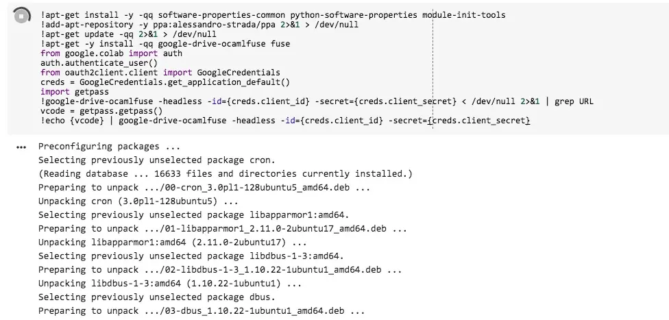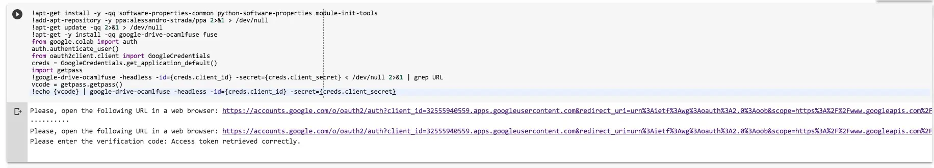 !echo {vcode} | google-drive-ocamlfuse -headless -id={creds.client_id} -secret={creds.client_secret}