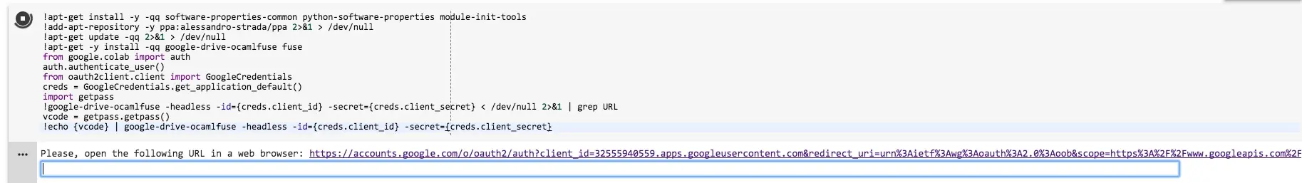 !google-drive-ocamlfuse -headless -id={creds.client_id} -secret={creds.client_secret} < /dev/null 2>&1 | grep URL