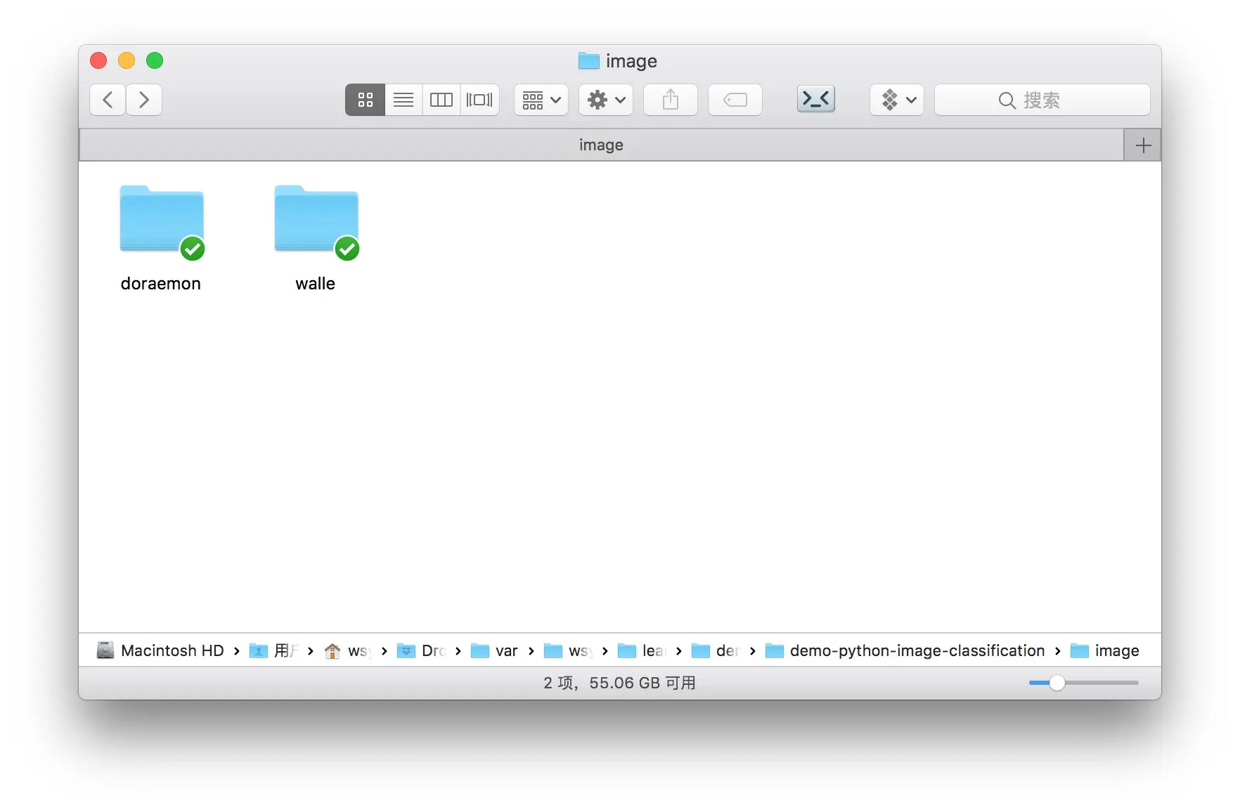 前面介绍了,image下,有哆啦a梦和瓦力这两个文件夹。注意如果将来你需要辨别其他的图片(例如猫和狗),请把不同类别的图片也在image中分别存入不同的文件夹,这些文件夹的名称就是图片的类别名(cat和dog)。