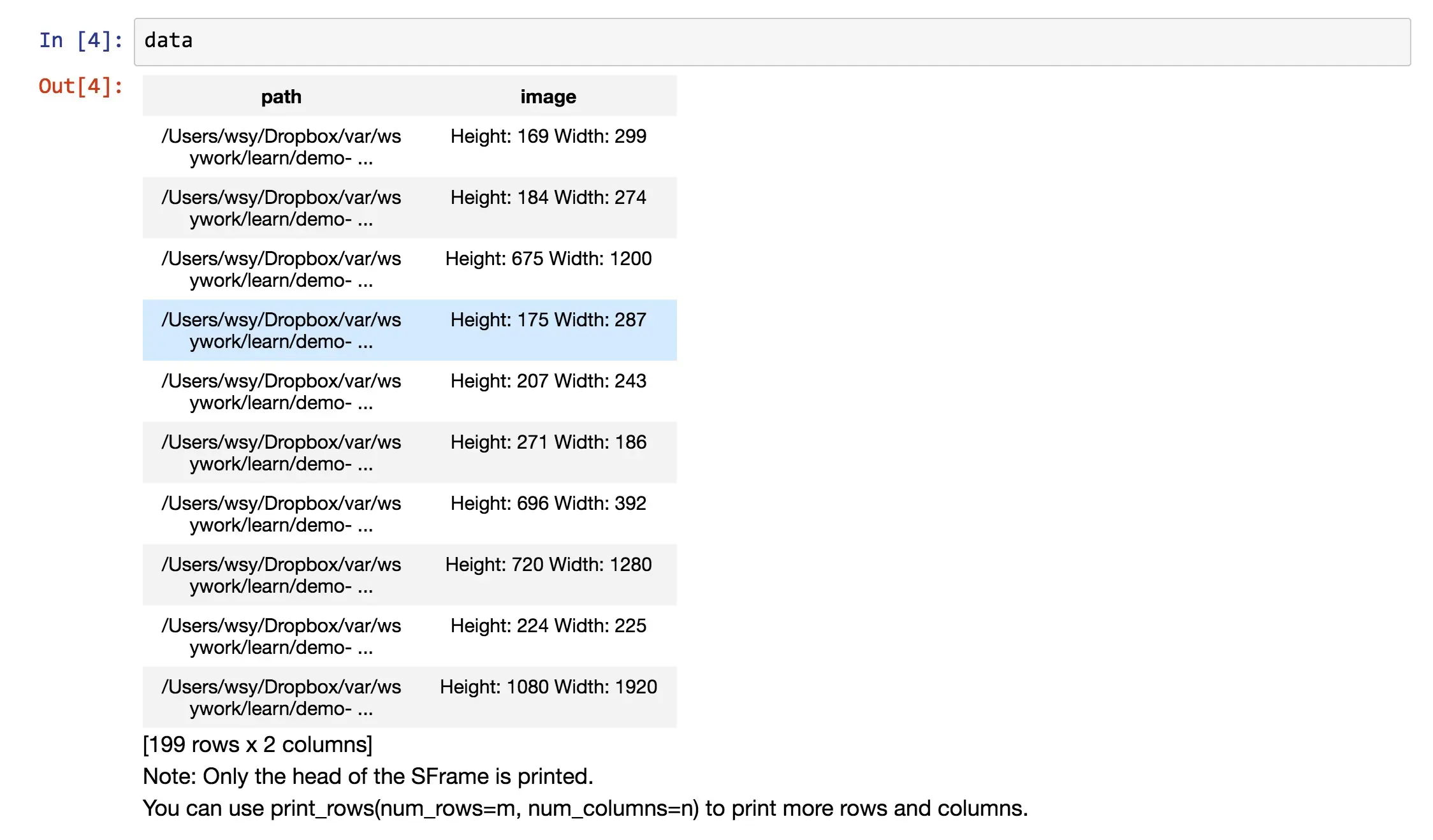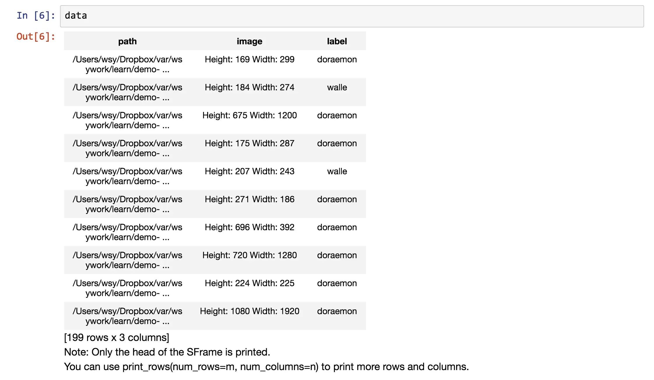 这个存储动作,让我们保存到目前的数据处理结果。之后的分析,只需要读入这个sframe文件就可以了,不需要从头去跟文件夹打交道了。