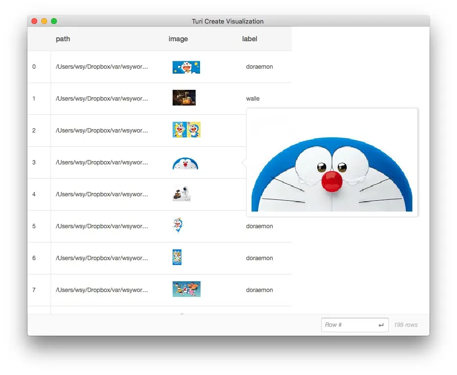 下面,我们需要让TuriCreate了解不同图片的标记(label)信息。也就是,一张图片到底是哆啦a梦,还是瓦力呢?