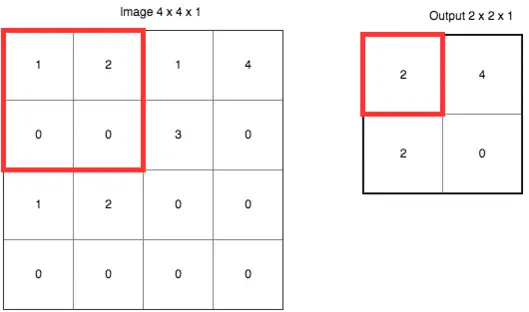 这里使用的是“最大值采样”(Max-Pooling)。以原先的2x2范围作为一个分块,从中找到最大值,记录在新的结果矩阵里。