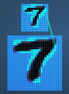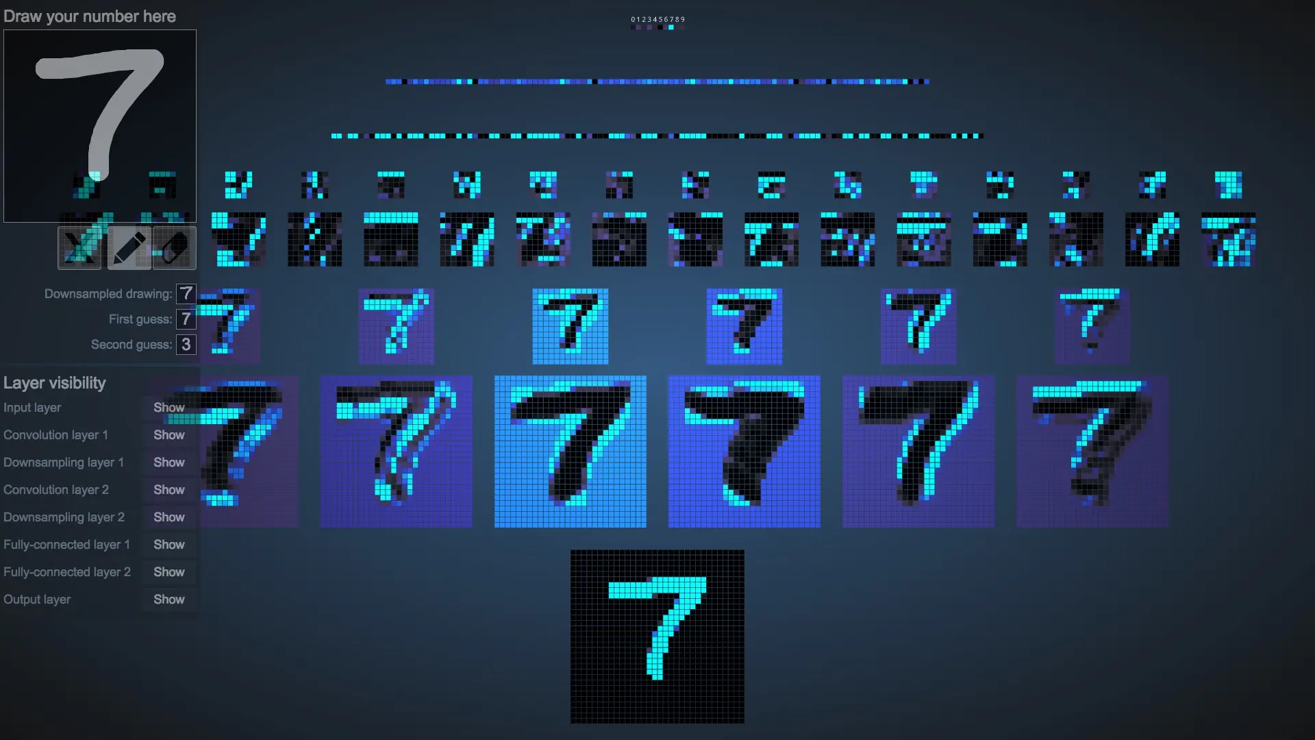 我们把鼠标挪到第一个卷积层。停在任意一个像素上。电脑就告诉我们这个点是从上一层图形中哪几个像素,经过特征检测(feature detection)得来的。