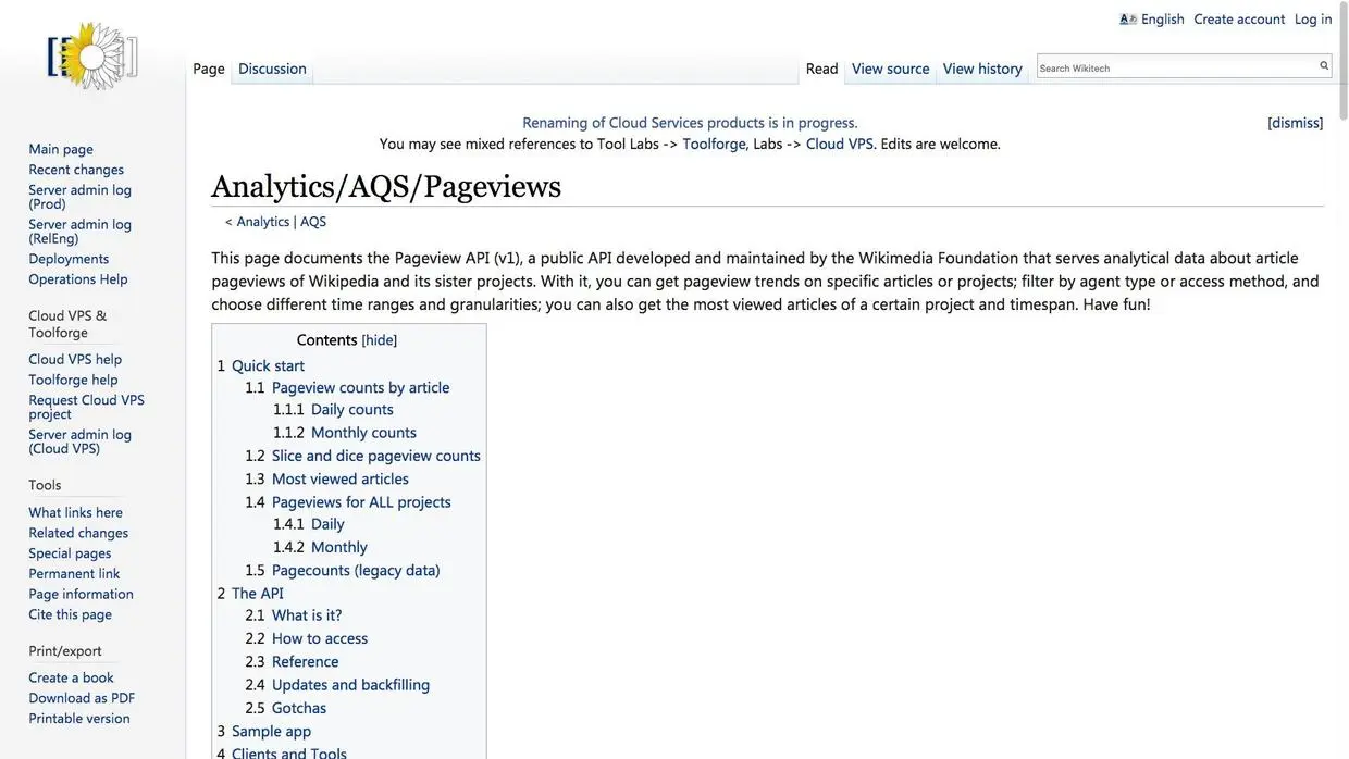 维基百科专门为我们提供了一类数据,叫做度量数据(metrics),其中就涵盖了页面访问次数这个关键值。对应API的介绍页面,在这里。