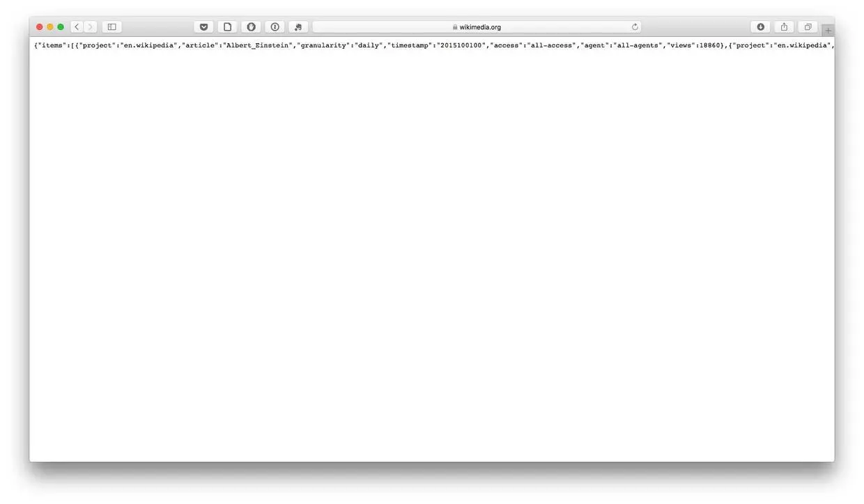 这一段里,我们看到项目名称(en.wikipedia),文章标题(Albert Einstein),统计粒度(天),时间戳(2015年10月1日),访问类型(全部),终端类型(全部),以及访问数量(18860)。
