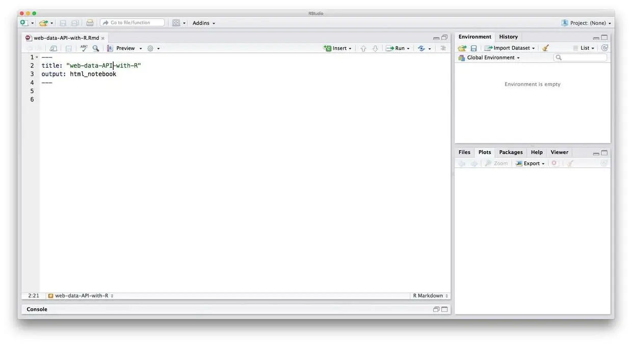 熟悉了环境后,我们该实际操作运行自己的代码了。我们把左侧编辑区的开头说明区保留,把其余部分删除,并且把文件名改成有意义的web-data-api-with-R。