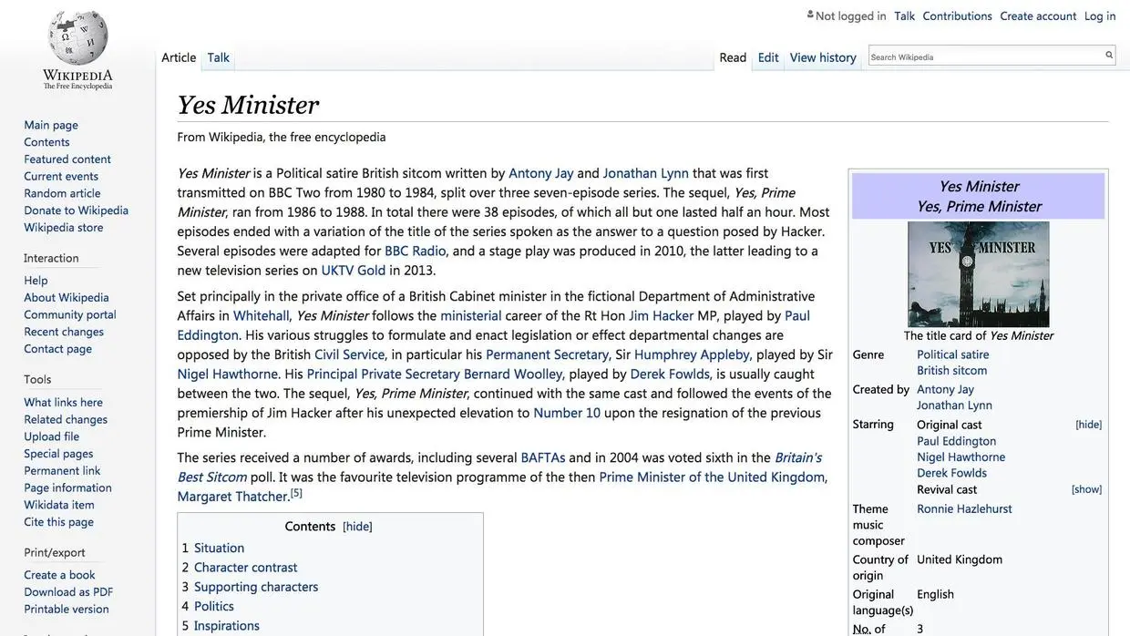 实际操作过程中,我们从维基百科上换另外一篇维基文章作为样例,以证明本操作方法的通用性。选择的文章是我们在介绍词云制作时使用过的,叫做“Yes, Minisiter”。这是一部1980年代的英国喜剧。