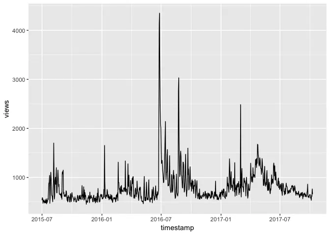 ggplot(data=df, aes(timestamp, views)) + geom_line()
