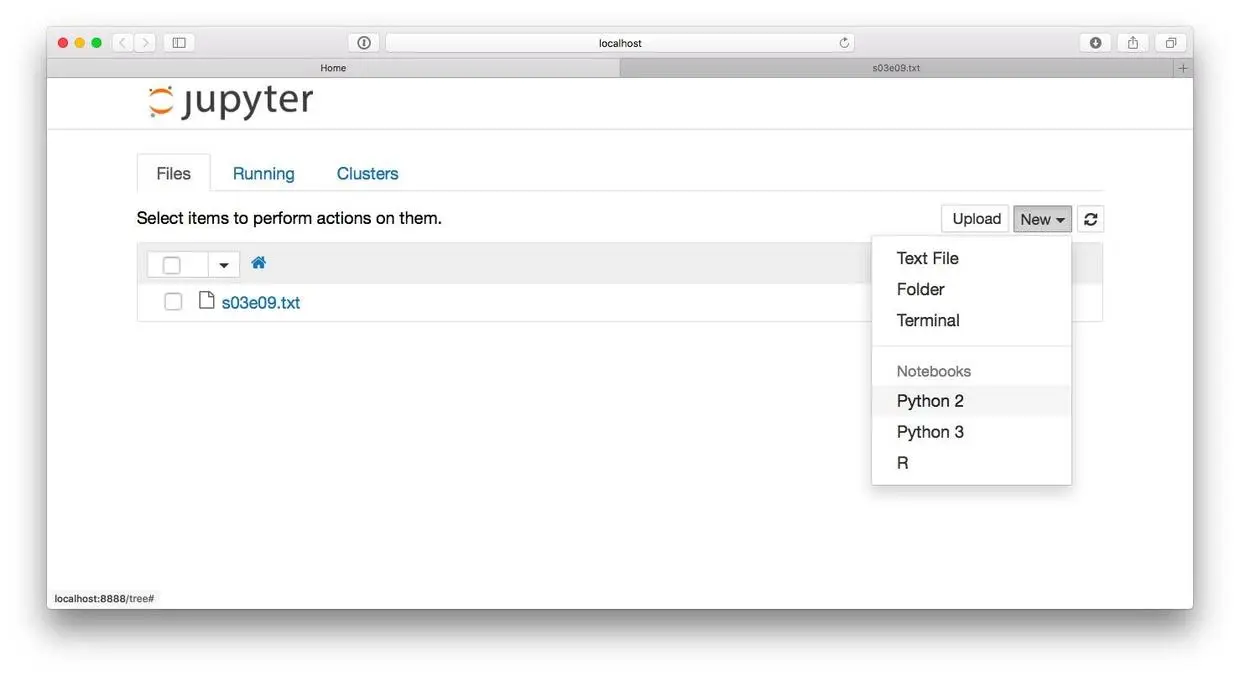 我们回到主页面下,新建一个Python的Notebook。点击右方的New按钮,选择Python 2。