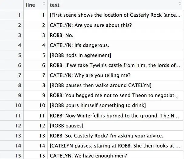 data_frame(word = c("stark", "mother", "father", "daughter", "brother", "rock", "ground", "lord", "guard", "shoulder", "king", "main", "grace", "gate", "horse", "eagle", "servent"),