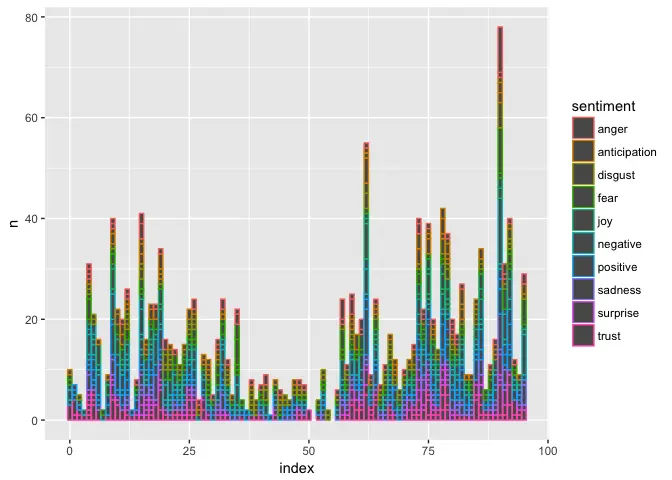 不过这张图也会给我们造成一些疑惑。按照道理来说,每一段落的内容里,包含单词数量大致相当。结尾部分情感分析结果里面,正向和负向几乎同时上升,这就让人很不解。是这里的几行太长了,还是出了什么其他的问题呢?