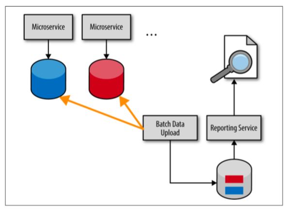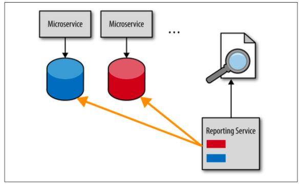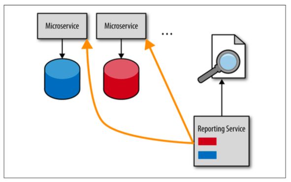 微服务中各个服务以及其相应的数据都是包含在一个单独的边界上下文中的,也就是说数据是隔离到多个数据库中的。因此,这也会使得收集微服务的各种数据生成报告变得相对困难。一般来说有四种方案解决这个问题。其中,前三种都是从各个微服务中拉取数据,是这里所说的反模式,被称作“Reach-in Reporting”。 数据库拉取模式