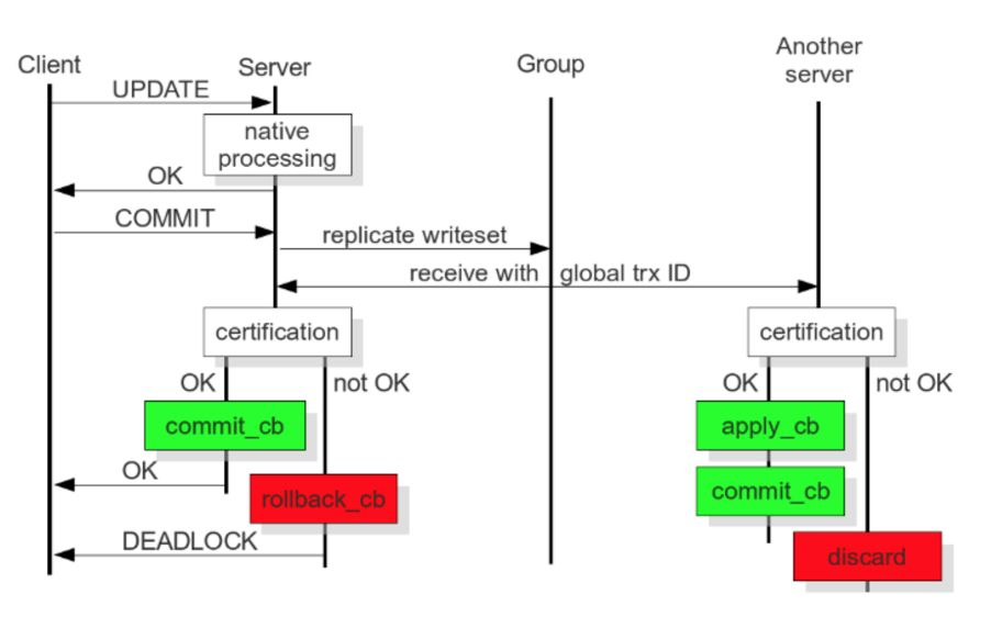 本地阶段:乐观执行,在事务 Commit 前,假设该 Transcation 在集群中复制时不会产生冲突。