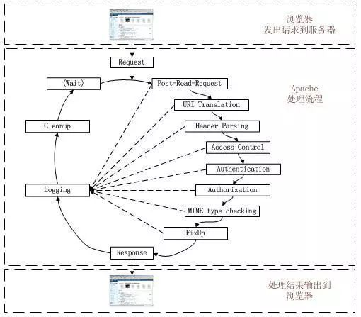 Apache将请求处理循环分为11个阶段,依次是:Post-Read-Request,URI Translation,Header Parsing,Access Control,Authentication,Authorization,MIME Type Checking,FixUp,Response,Logging,CleanUp。