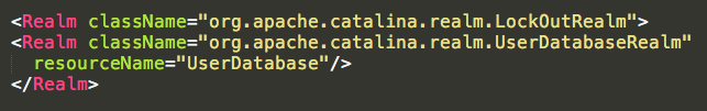 Realm,可以把它理解成“域”;Realm提供了一种用户密码与web应用的映射关系,从而达到角色安全管理的作用。在本例中,Realm的配置使用name为UserDatabase的资源实现。而该资源在Server元素中使用GlobalNamingResources配置:
