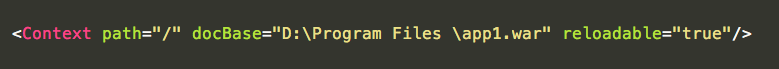 在该例子中,docBase位于Host的appBase目录之外;path属性没有指定,而是根据app1.xml自动推导为”app1”;由于是在开发环境下,因此reloadable设置为true,便于开发调试。