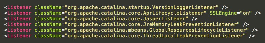 VersionLoggerListener:当Tomcat启动时,该监听器记录Tomcat、Java和操作系统的信息。该监听器必须是配置的第一个监听器。