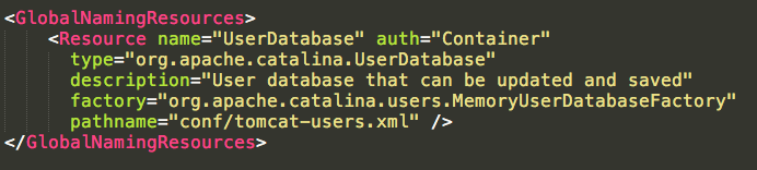 GlobalNamingResources元素定义了全局资源,通过配置可以看出,该配置是通过读取$TOMCAT_HOME/ conf/tomcat-users.xml实现的。