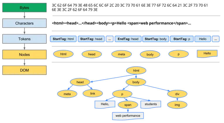 DOM概念之于Web开发人员再熟悉不过了,当浏览器发出请求并接收到HTML文档后,它会有这样一个流程来构建DOM:字节 → 字符 → 令牌 → 节点 → 对象模型。