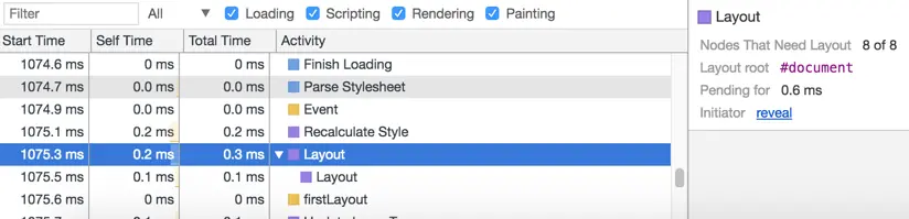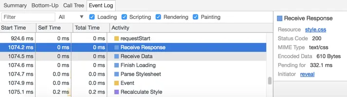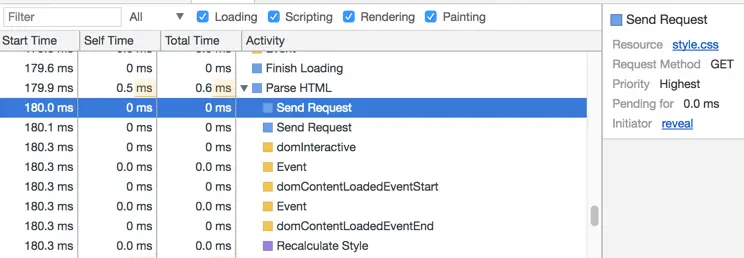 前面谈到CSS会阻塞浏览器的渲染过程,因为渲染树的构建同时需要DOM和CSSOM,所以当浏览器请求的style.css返回之后,浏览器会开始解析样式表,并重新计算样式(Recalculate Style),将CSS转换成CSSOM,然后进行后续的操作。