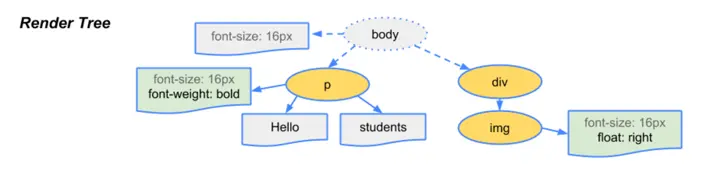 渲染树的构建会从DOM的根节点开始遍历,对于不可见节点会忽略,然后在CSSOM中找到每个对应节点的样式规则并应用,最后输出的渲染树会包含所有的可见内容和样式信息,如下图: