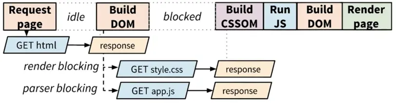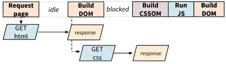 JavaScript和CSS资源请求是并行的,但仍然需要等到CSSOM构建完成之后,JavaScript才可以执行,然后在进行后面的渲染工作。于是,当 DOM、CSSOM 和 JavaScript 执行之间有大量的依赖关系时,就很可能导致浏览器在处理及渲染网页时出现延迟。
