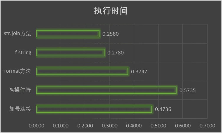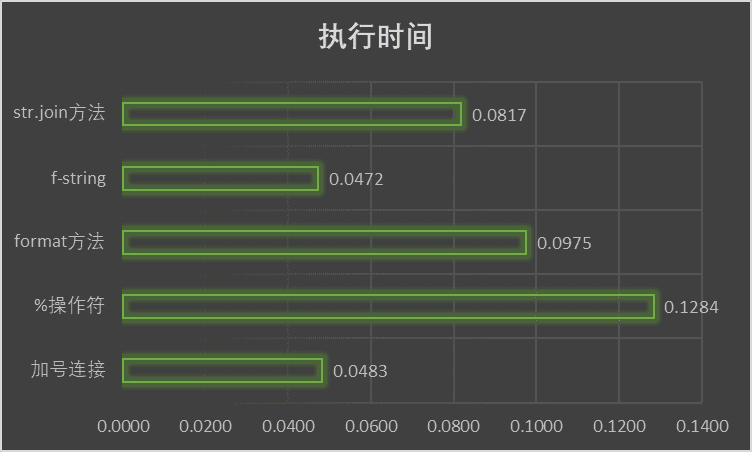 可以看到,%操作符、format和f-string都是字符串格式化方法,性能依次递增,加号连接的性能和f-string不相上下。