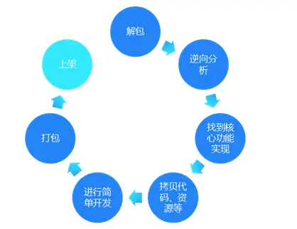 山寨APP的问题由来已久,实际上,大部分APP都有过被仿冒的经历。据统计,热门应用平均有27个山寨APP,严重危害到了正版应用和用户的利益。如下图所示,通过简单的解包、逆向分析、代码拷贝、简单开发并打包就可以完成山寨应用上架,暴利产业链下还有更多的开发者趋之若鹜,仿冒形式也是多种多样。