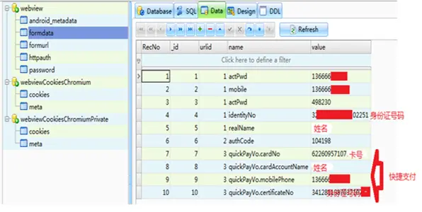 金融、支付类App一直是数据泄露的重灾区,多达88%都存在内存敏感数据泄露问题。如下所示,即为常见的金融、支付类本地存储数据泄漏。