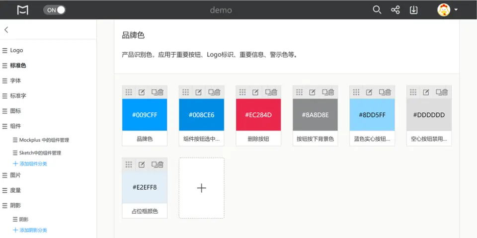 制定良好设计规范的第一步就是合理归类。你需要先明确你需要整理的内容有哪些,这些内容的分类又该怎样呈现。比如在摹客设计系统中,你可以建立多个库、分类和子分类来进行管理,每个库里包含2大类资源分类,第一类是文件类资源,其包含Logo、图片、图标、组件、字体;第二类是编辑类资源,包括颜色、度量、标准字、阴影。基本满足了设计师的多种设计类型需求。