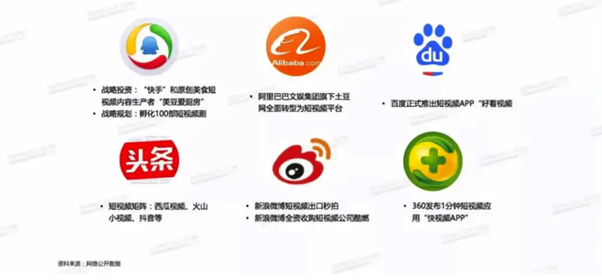 以短视频为例,自2017年开始,短视频呈爆发式增长,热度持续走高,互联网巨头腾讯、阿里巴巴、百度、头条、新浪微博、360都通过投资或者升级的方式来打造符合品牌的短视频矩阵: