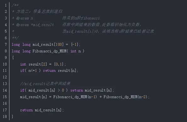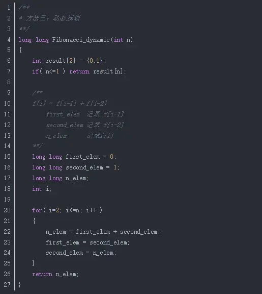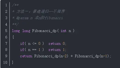 【解法一】常规递归 不足:此法不推荐,原因是会产生大量重复的计算,而且重复的结点会随着n的增大而急剧增加。 事实上,用递归方法计算的时间复杂度是以n的指数方法递增的 【解法二】带备忘录的递归 此法在解法一的基础上加了一个存储,避免了大量重复结点的计算,比法一效率高很多 【解法三】动态规划 此题满足动规的特点:新问题依赖子问题。于是考虑可自底向上的思考方式: 首先根据f(0)和f(1)得到f(2) 然后根据f(1)和f(2)得到f(3) ...