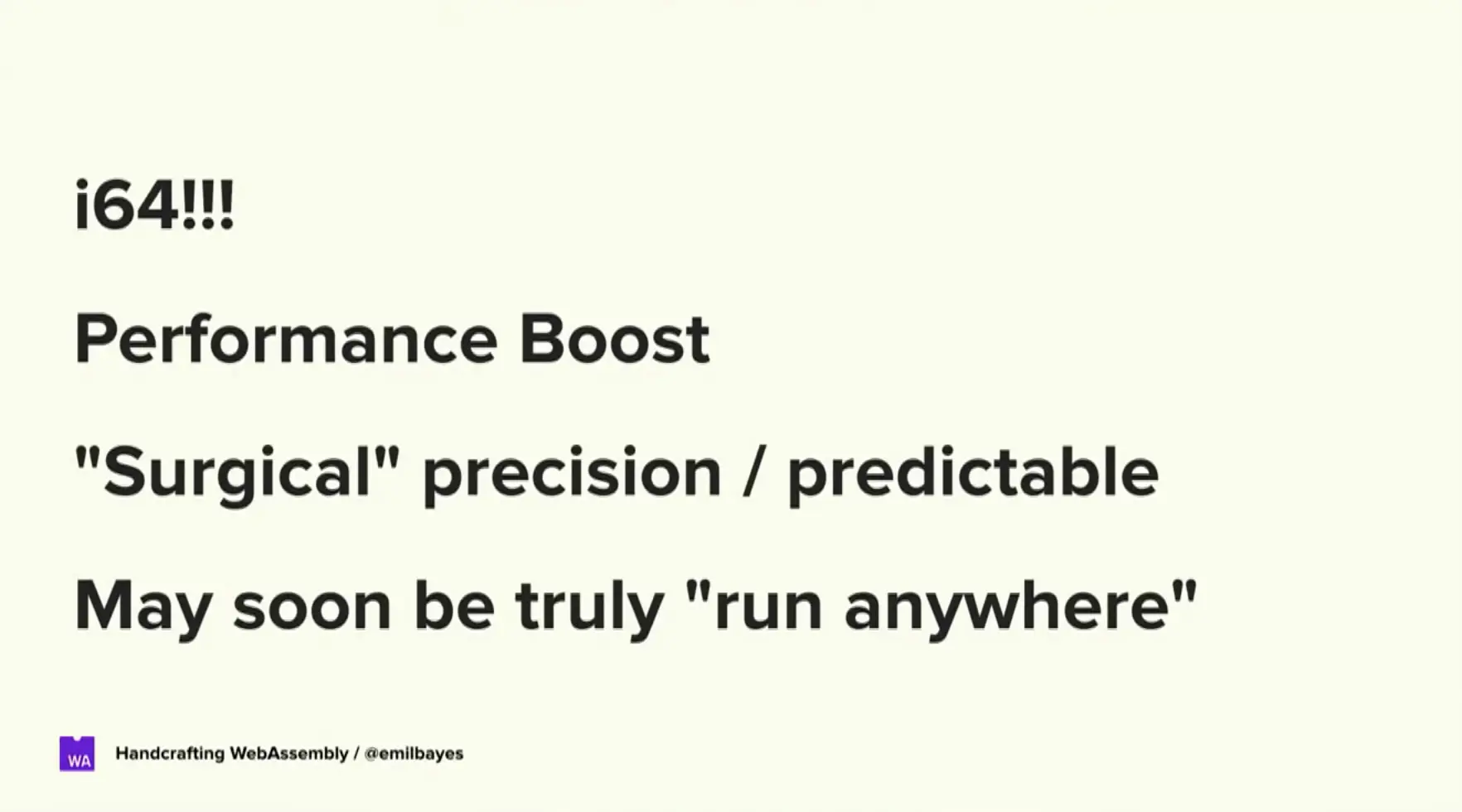 64位整型(i64) WebAssembly最让我兴奋的的是它可以使用64位的整型数字,这让我们可以精确的描述那些需要数字计算的事物。由于我的工作是关于密码学的,我们经常需要处理256位或者512位长度的二进制数字,64位整型数字的支持对性能提升确实很有效。