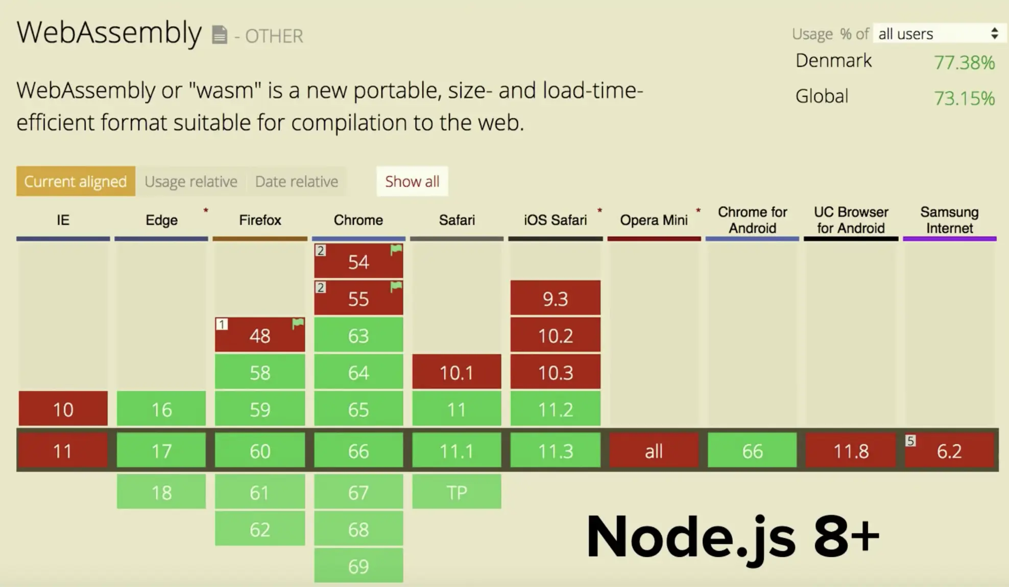 WebAssembly不是什么未来的黑科技,现在丹麦已经有超过77%的浏览器支持,而全球也已经有超过73%的浏览器支持,而且Node.js 8.0以上也支持WebAssembly,所以你现在就可以使用它。