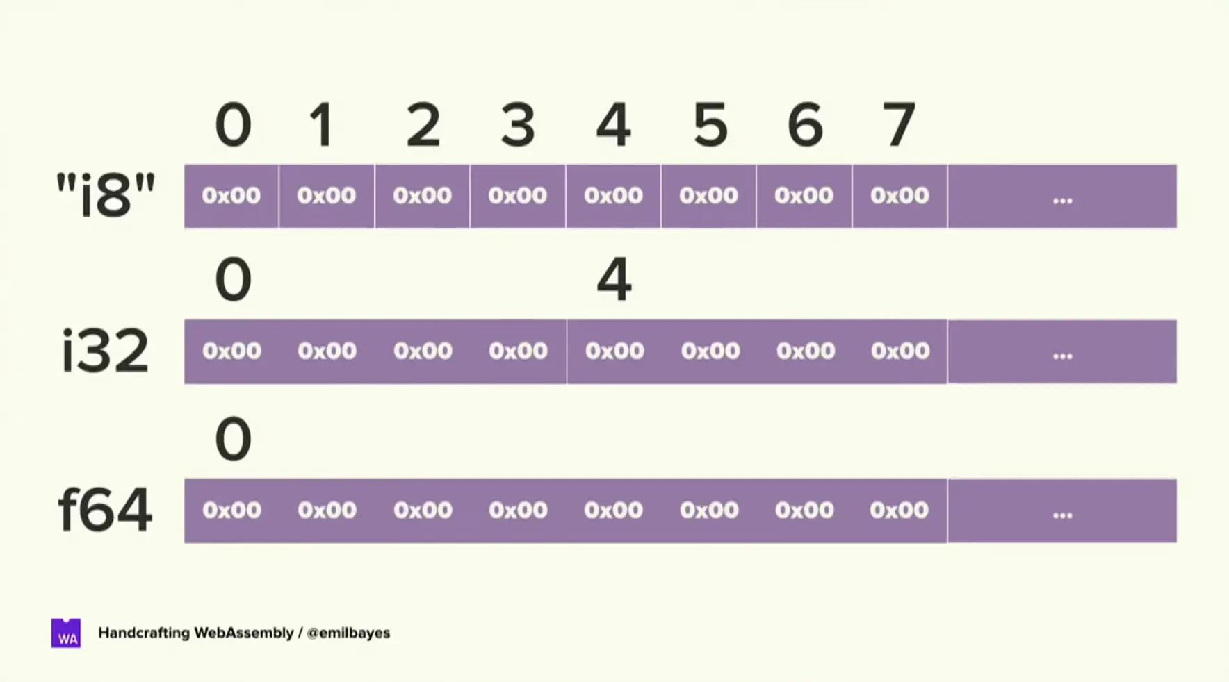 通过这个例子,我们来看下数字在memory里面是如何存储的。如下图,我们可以看到i8类型表示的是八个比特位(bit)整型数字,也就是一个字节(byte)。i32表示的是四个字节长度的整型数字,f64表示的是八个字节的浮点型数字。所以说memory其实就是一个字节数组。在JavaScript里面数字只有Number类型,我们也不需要关心数字在内存中是如何存储的,但是在WebAssembly里,你必须知道如何为一个数字分配合适它的内存(定义合适的类型)。