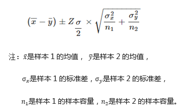 由前面计算得出的Z 值,再根据两个总体的均值、标准差和样本大小,利用以下公式即可求出两个总体均值差的95%置信区间。